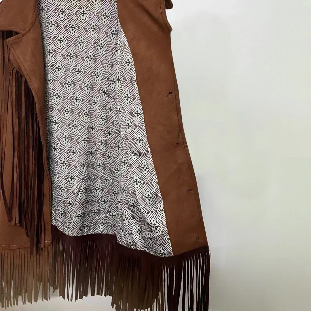 Casual Suede Leather Jacket Brown Lapel Pocket Fashion Woman Single Button Long Sleeve Tassel Coat Lady Spring Street Outwear