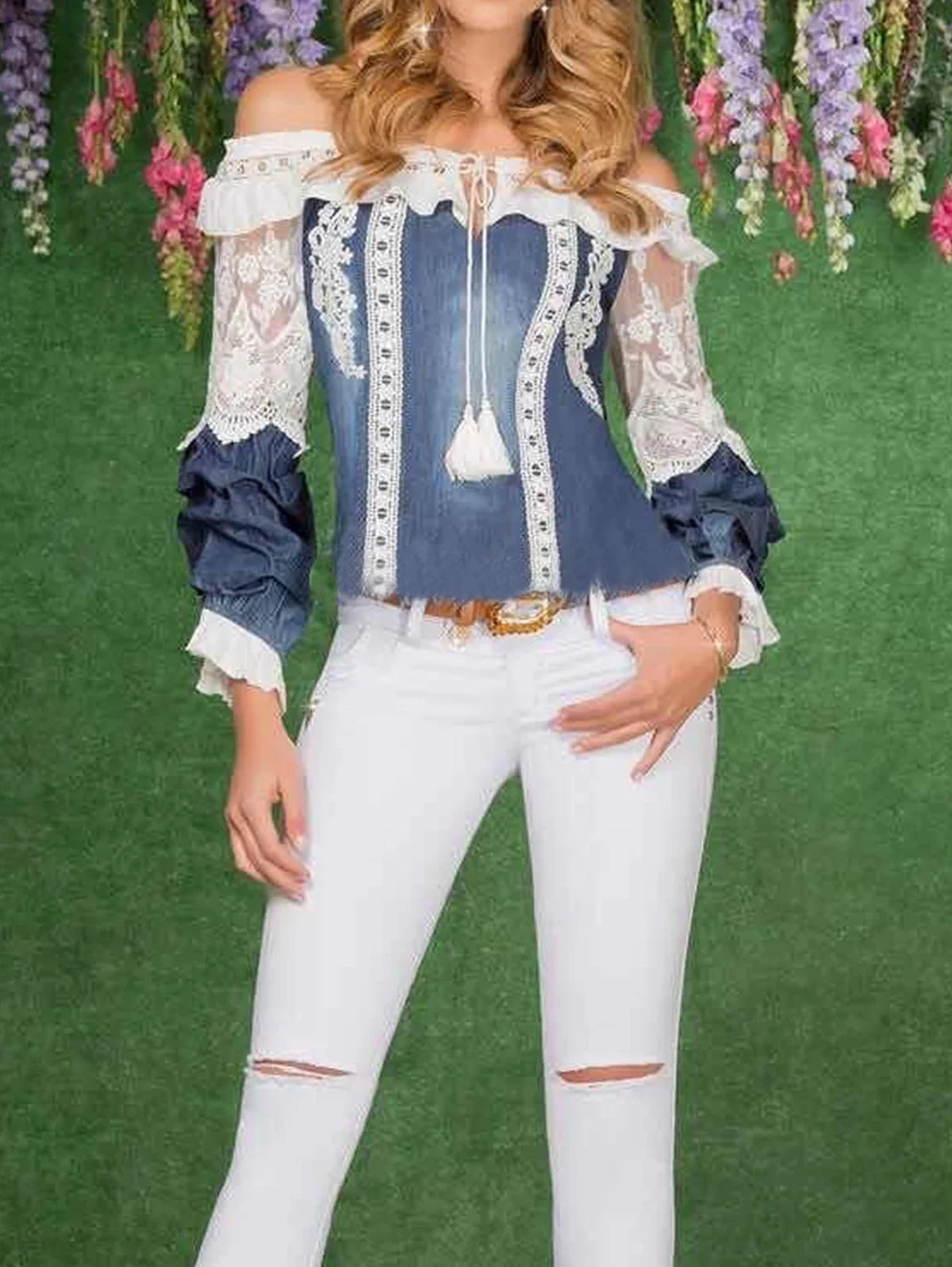 Fashionable Lace Patchwork Washed Denim Blouse Tops Summer Shirt Girl Women Drawstring Off Shoulder Long Sleeve Slim Shirts