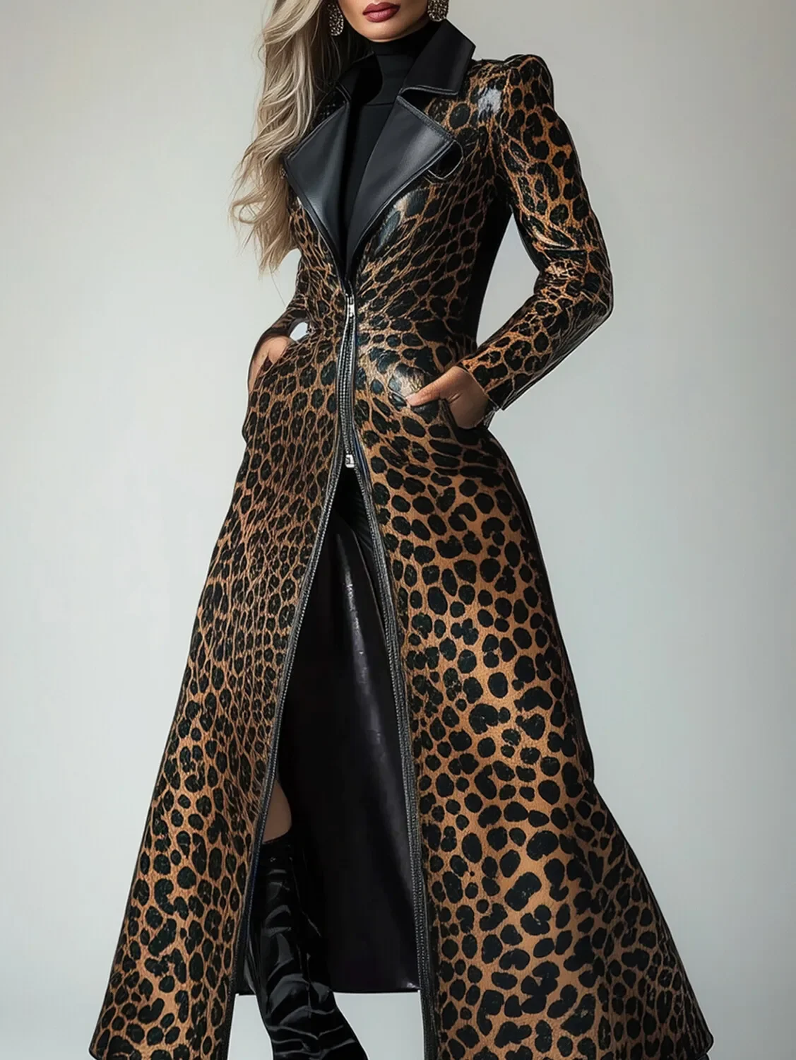 PU Leather Leopard Pattern Zipper Pocket Trench Coat