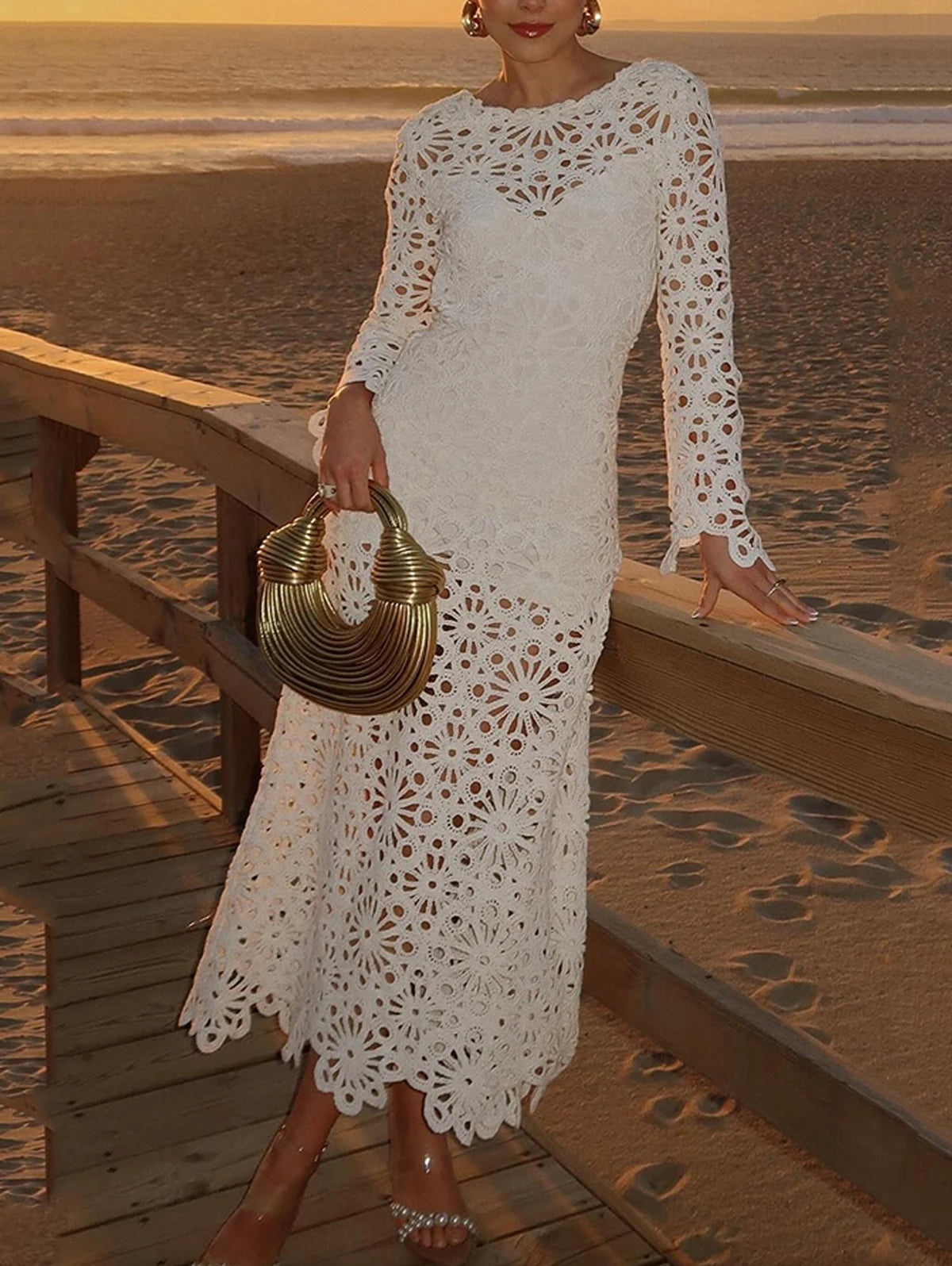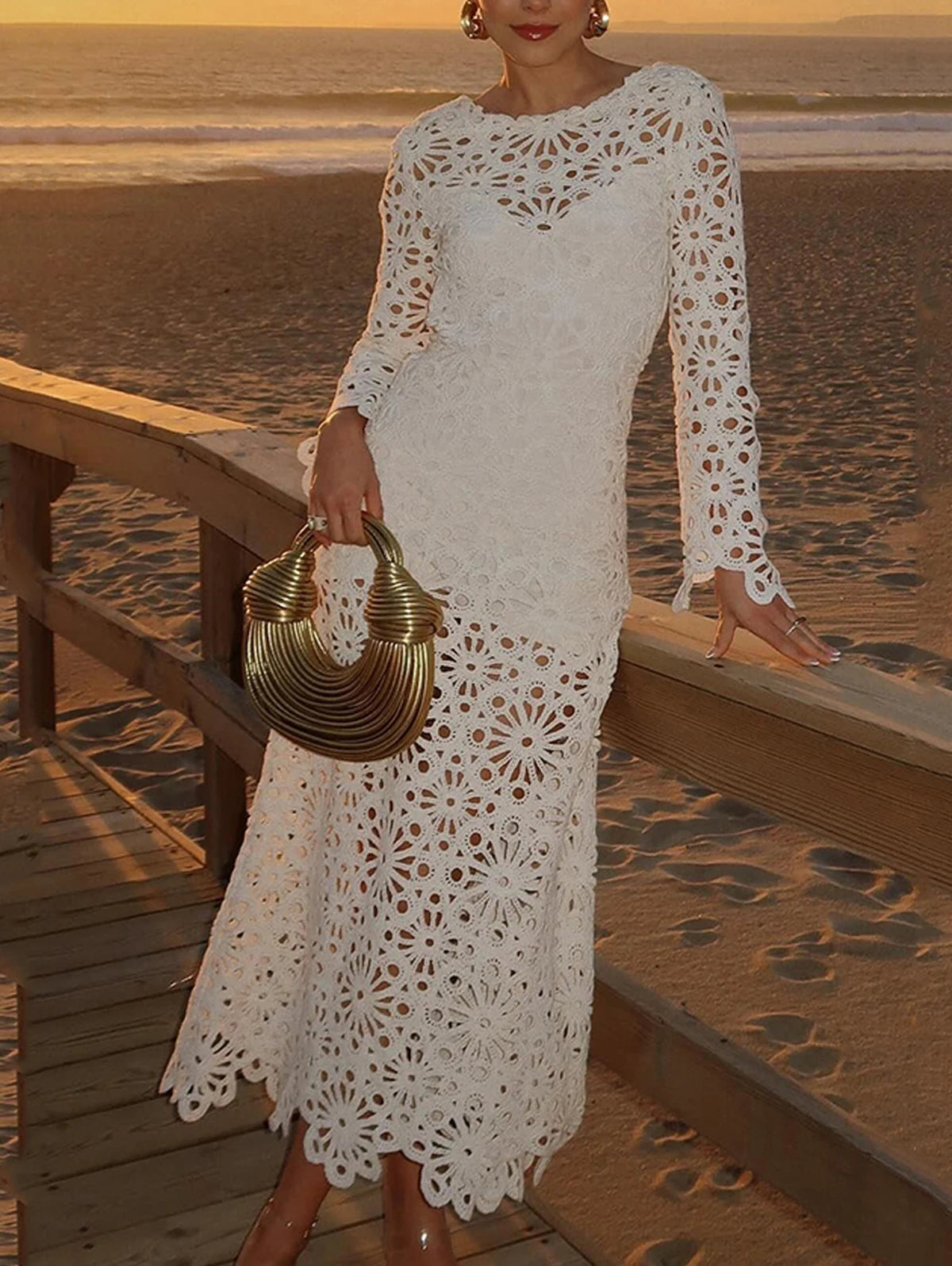 Sexy O Neck Hollow Long Sleeve Party Dress Fashion Lace Embroidery Women's Beach Dress Summer Holiday Cover Up Maxi Dress Mujer