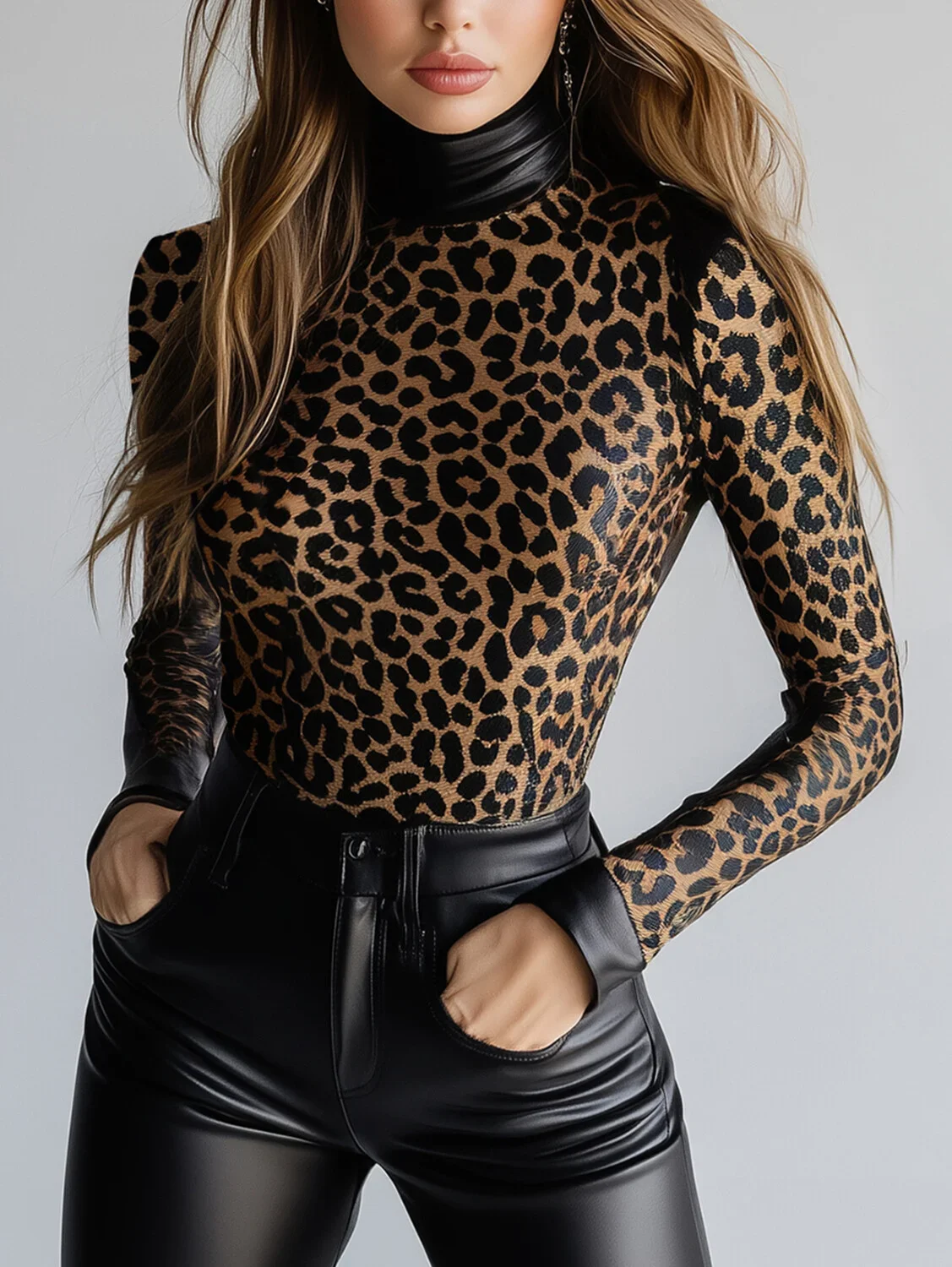 Women PU Leather Leopard Pattern High Neck Long Sleeve Blouse Slim Fit PU Clothes Leather T Shirt High Street Streetwear